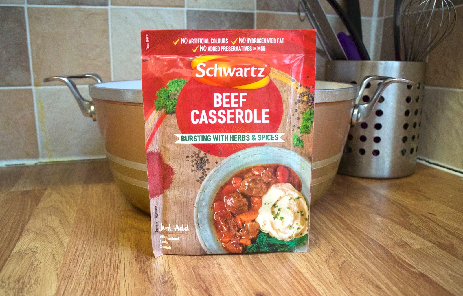 I was lucky enough to receive a sachet of the Beef Casserole Mix* which can be purchased from Tesco’s here* for just 85p which is an absolute steal. When I received it in the post, I went straight to the shops to get some ingredients and start cooking. I’m not going to lie, this was my first time ever making a beef casserole, so I spent half a day reading up on all the different ways I could make the casserole, jut to find out that the packet had the preparation and recipe on it.
