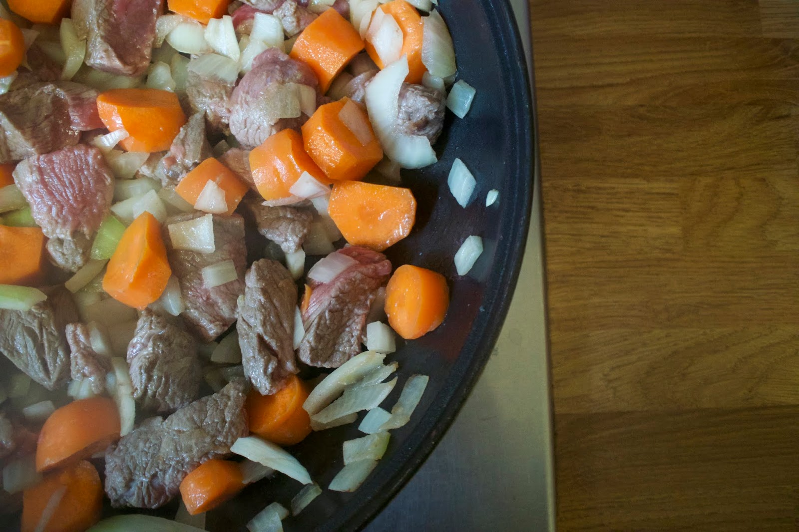 - Heat the oil, brown the beef, onion and carrots for 5 minutes, until golden. Drain excess liquid and transfer to a casserole dish.