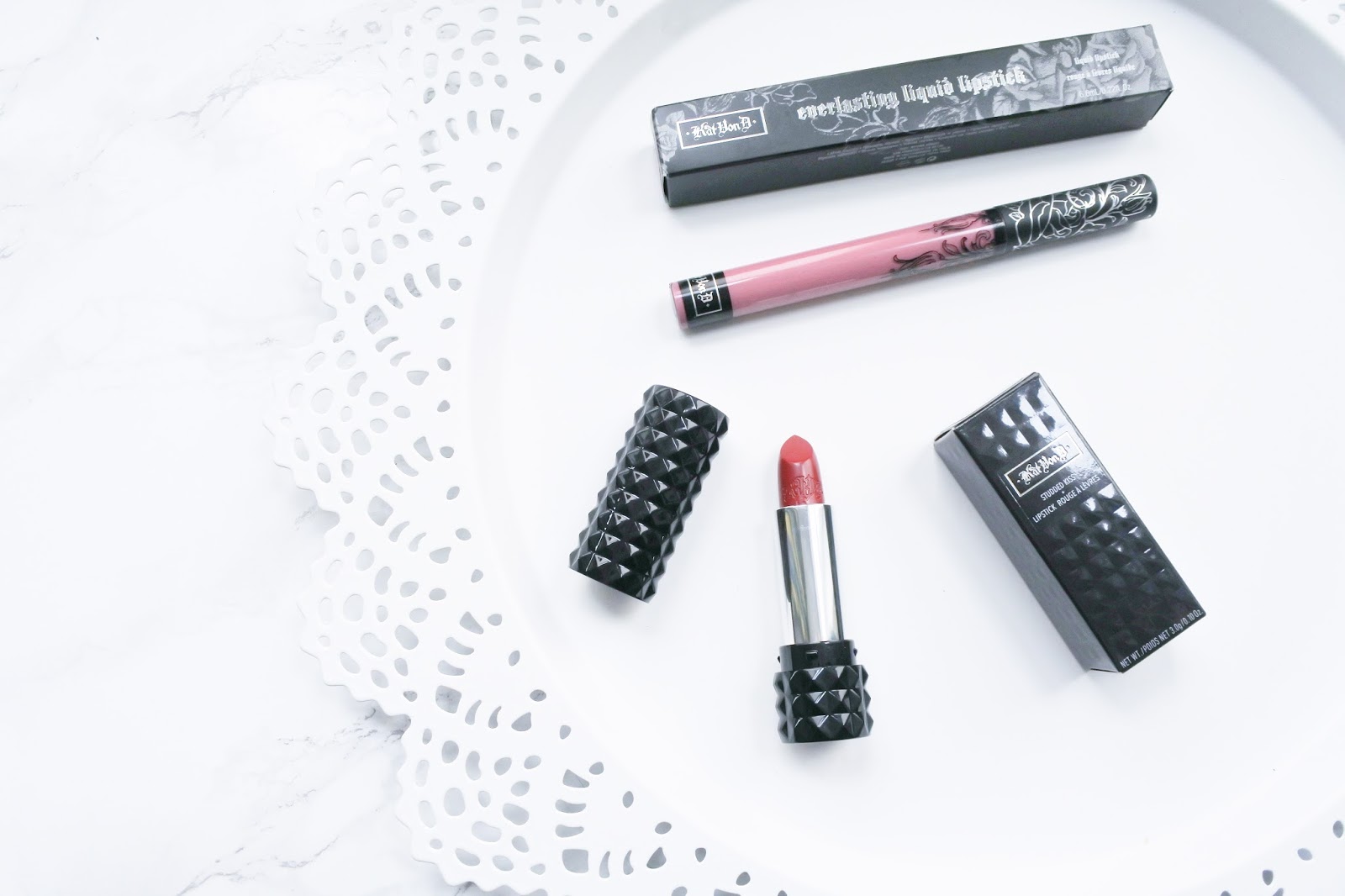 Hey lovelies, so recently I got paid an eight week paycheque from work and so I decided to buy some new lipsticks. Not that I need anymore but I’d been dying to try the Studded kiss Lipsticks from Kat Von D, I have previously tried the everlasting lipsticks.